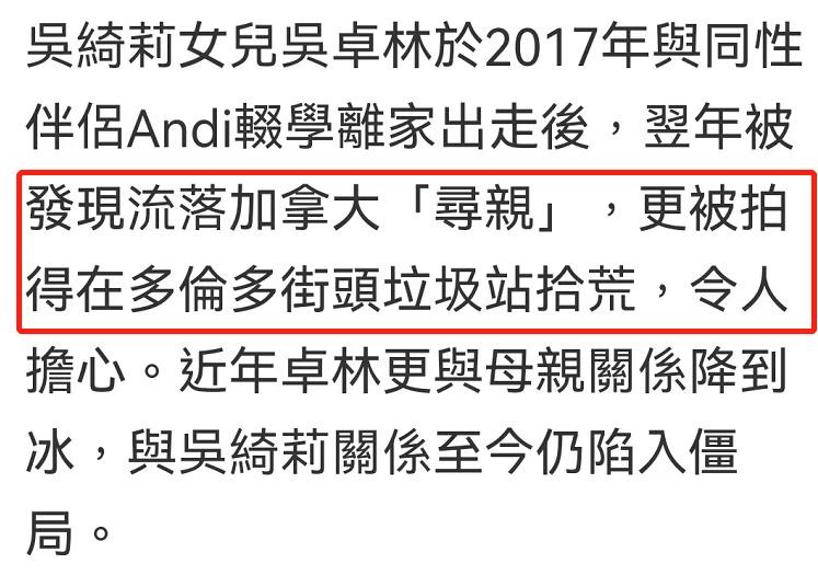 早前就曾因为被拍到沦落在多伦多街头垃圾站拾荒引发外界热议,当时吴卓林被妈妈吴绮莉的好友接回香港生活,但因为吴绮莉不满女儿的外籍妻子,两人关系一直到如今依旧保持紧张,持续陷入僵局。