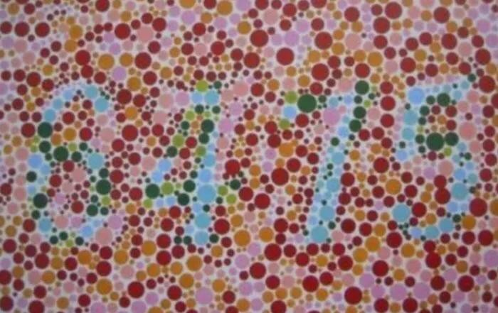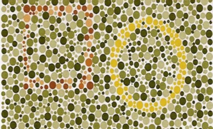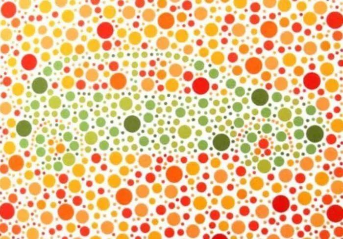 图五的干扰信息较多,光是底色就有三种颜色,分别是橘色、红色以及粉红色,中间的数字是由蓝色、绿色的小圆形构成的数字“6475”,可以说不管是全色盲、红绿色盲、蓝黄色盲都能检测出来。大家看到这种较为复杂的图不要紧张,只要不是色盲,经过仔细辨认还是能够说出图中数字的 可若是怎么都无法辨认出图中的每种颜色与数字,那就是色盲无疑了。