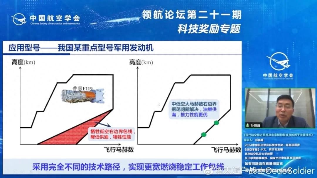 “中国航空学会领航论坛”直播画面,中国先进战机使用的“某重点型号发动机”,也就是涡扇-15发动机,实现了更宽燃烧稳定工作包线,且低空高速性能更好。