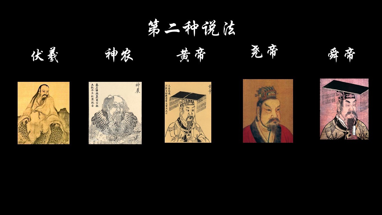 第二种说法是:伏羲、神农、黄帝、尧、舜;
