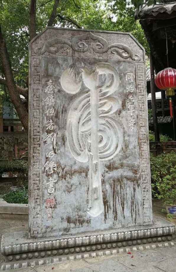 刘明灯(1838—1895年),字照远,号简青,湖南张家界永定区二家河乡人,清朝土家军主帅,中国清朝武官官员。刘明灯任台湾总兵,过草岭时,突遇暴风雨,便书此一笔虎字加以镇压,取《易经》“风从虎、云从龙、圣人作而万物睹”之意。以“虎啸而谷风至”,“风至而雾散”的道理。就地挥毫此“虎”字,命属下勒刻于巨石上,以镇风魔。为了弘扬本土文化,刘明灯命人从台湾草岭拓印复制虎字回家乡,以示寻祖归根之意。