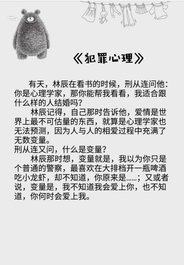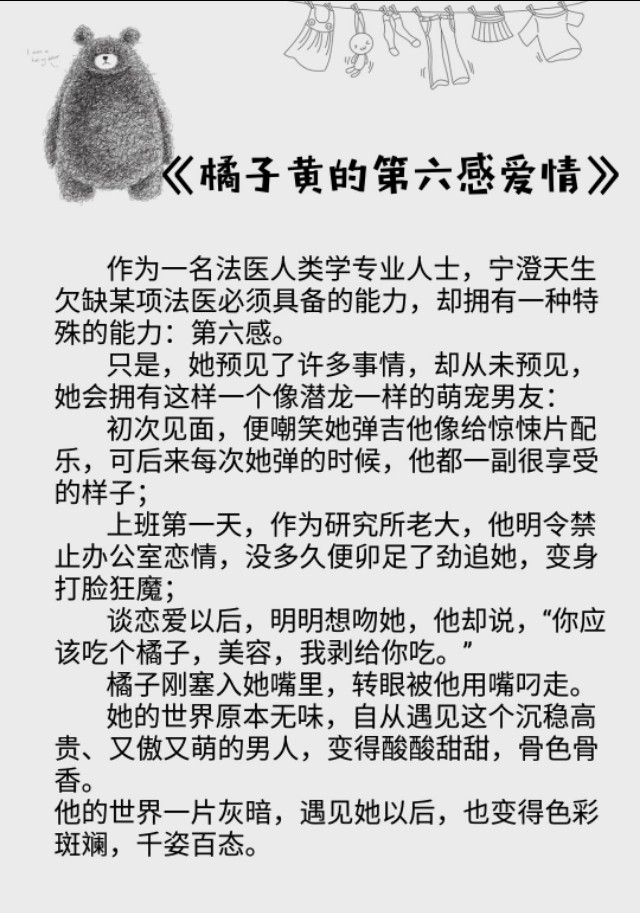 悬疑文里小清新,先婚后爱,破案悬疑,感情戏写的很好,男女主性格人设也好看,案件写的偏弱,推理悬疑色彩不足,但如果想要看言情顺便带点悬疑色彩的文,这个强推!