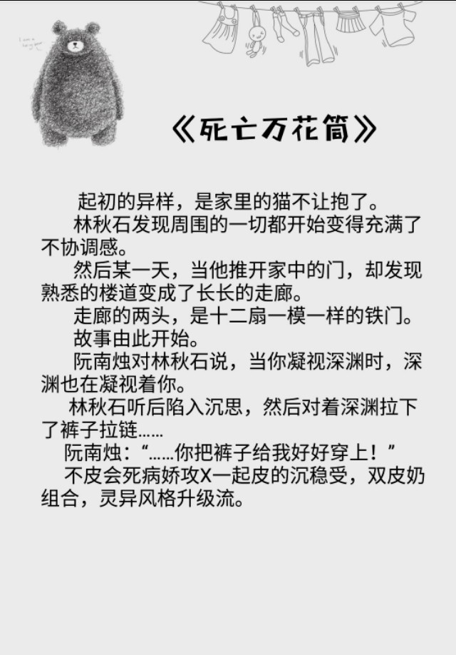 虽然我不是很喜欢这个文的感情线,有点太复杂,但是主剧情灵异惊悚还是看的很爽