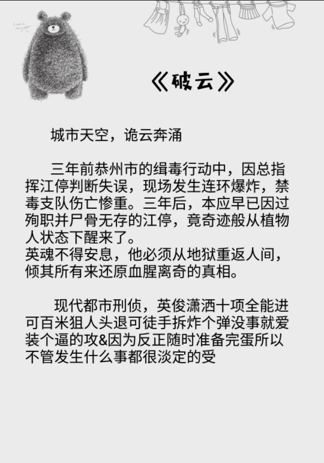 bl,刑侦,悬疑缉毒,男主是勇往直前不怕牺牲的缉毒英雄。攻受人设都很讨喜,坏人很难猜