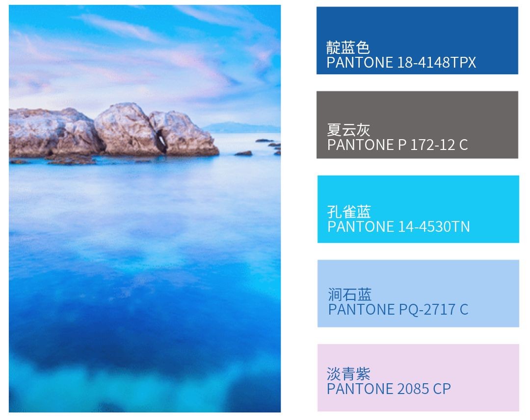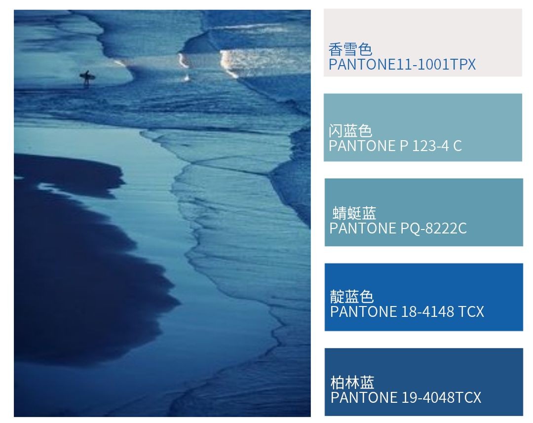本组配色通过变换彩度与明度,用蓝色打造出丰富的层次感和立体感。极具包容性的香雪白,在这组配色中,既可以作为基础色使用,也可作为点缀,用在蓝色的“海洋”中。
