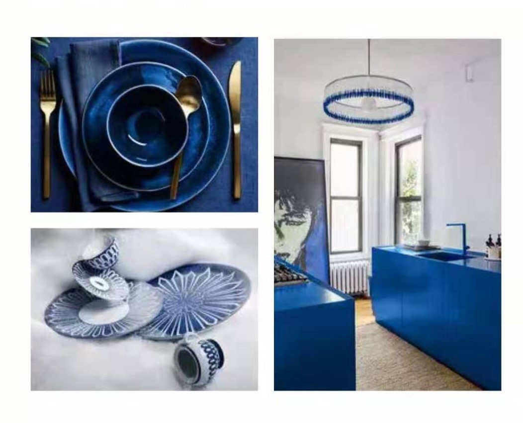 靛蓝色、孔雀蓝和涧石蓝,通过明度和彩度的变化,让这组色彩更具有层次。我们身处在这样的蓝色空间,就仿佛徜徉在水天一线的天空之境。