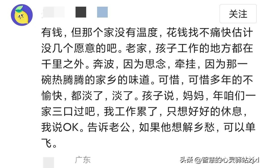 22. 有钱,但那个家没有温度,花钱找不痛快估计没几个愿意的吧。老家,孩子工作的地方都在千里之外。奔波,因为思念,牵挂,因为那一碗热腾腾的家乡的味道。可惜,可惜多年的不愉快,都淡了,淡了。孩子说,妈妈,过年咱们一家三口过吧,我工作累了,只想好好的休息,我说OK。告诉老公,如果他想解乡愁,可以单飞。