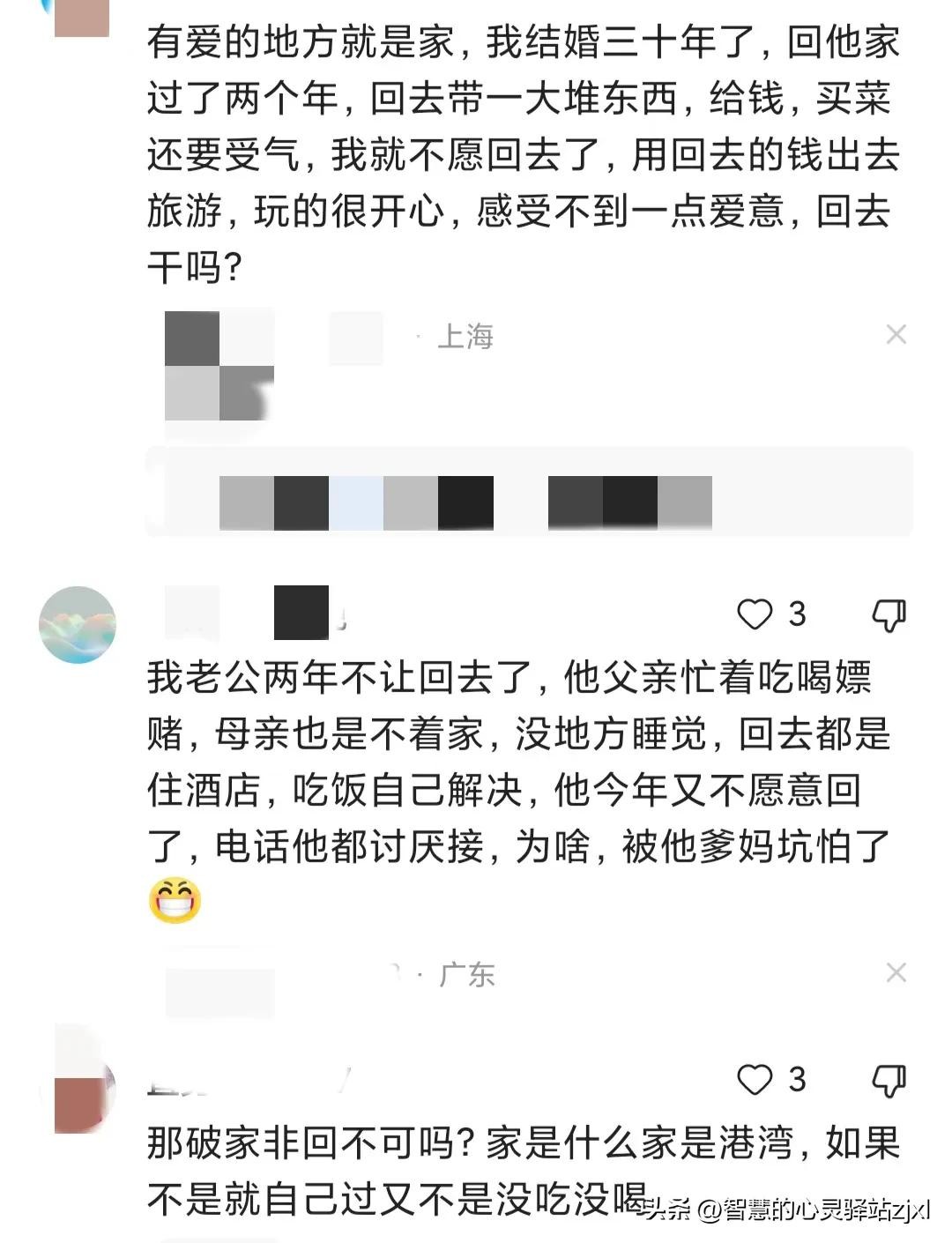 1. 有爱的地方就是家,我结婚三十年了,回他家过了两个年,回去带一大堆东西,给钱,买菜还要受气,我就不愿回去,用回去的钱出去旅游,玩的很开心,感受不到一点爱意,回去干吗?