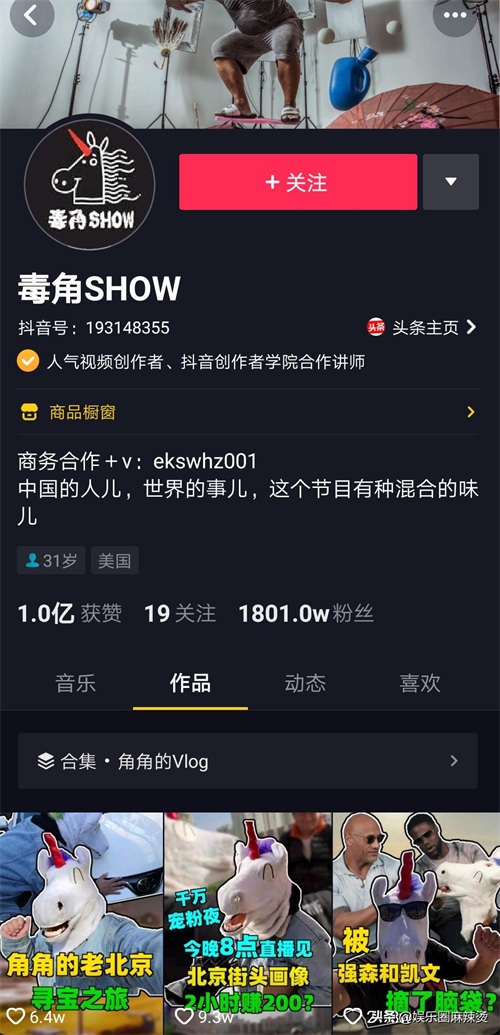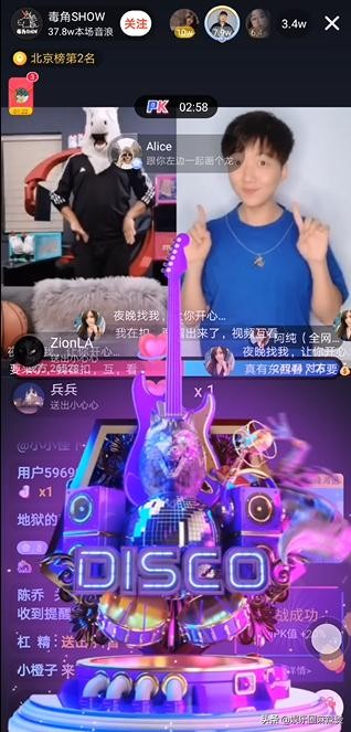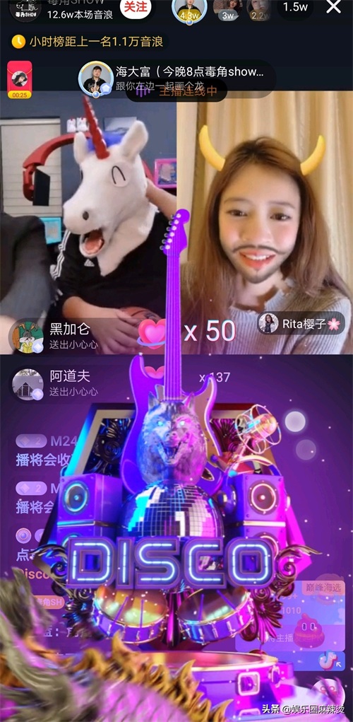 在12月6日晚间,抖音千万宠粉夜的活动迎来了一个"神秘男子",他就是站内的潮男VLOG达人毒角SHOW,角角的"半永久"独角兽头套已经成为了他的标志符号,这次角角在直播间也是十分放得开,多次与连麦达人进行舞蹈battle,引得路过的粉丝纷纷围观,直播间人气也是一路飙升到4万,稳居北京榜第一的位置。