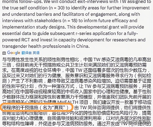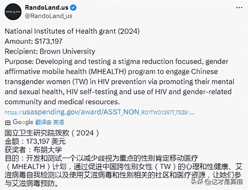 因此,布朗大学得到美国国立卫生研究院的拨款,金额是173197美元,用于开发和测试一个以减少歧视为重点的性别肯定移动医疗(MHEALTH)计划,来促进他们所谓的中国跨性别女性(TW)的心理和性健康。