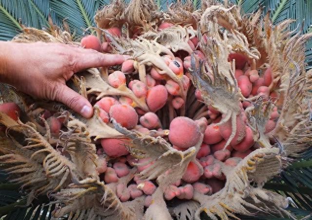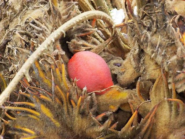凤凰蛋开花结果的过程可谓是一个奇观了,毕竟被人们誉为铁树的它竟然开花了,而且还让很多人叹为观止。凤凰蛋的花很奇特,并不像我们平常见到的其它花那样,它的花是鲜艳的红色,看上去很特别,而且也非常亮眼,让人远远望去一眼就能找到它。凤凰蛋的花瓣很像是银树叶,看起来就像一个小扇子,每朵花有4到5个花瓣,排列很稀疏,在花瓣中间是又长又卷的花蕊,这些花蕊比花瓣要长很多,和普通的花形态很不一样,这也是人们对它称奇的原因之一了。