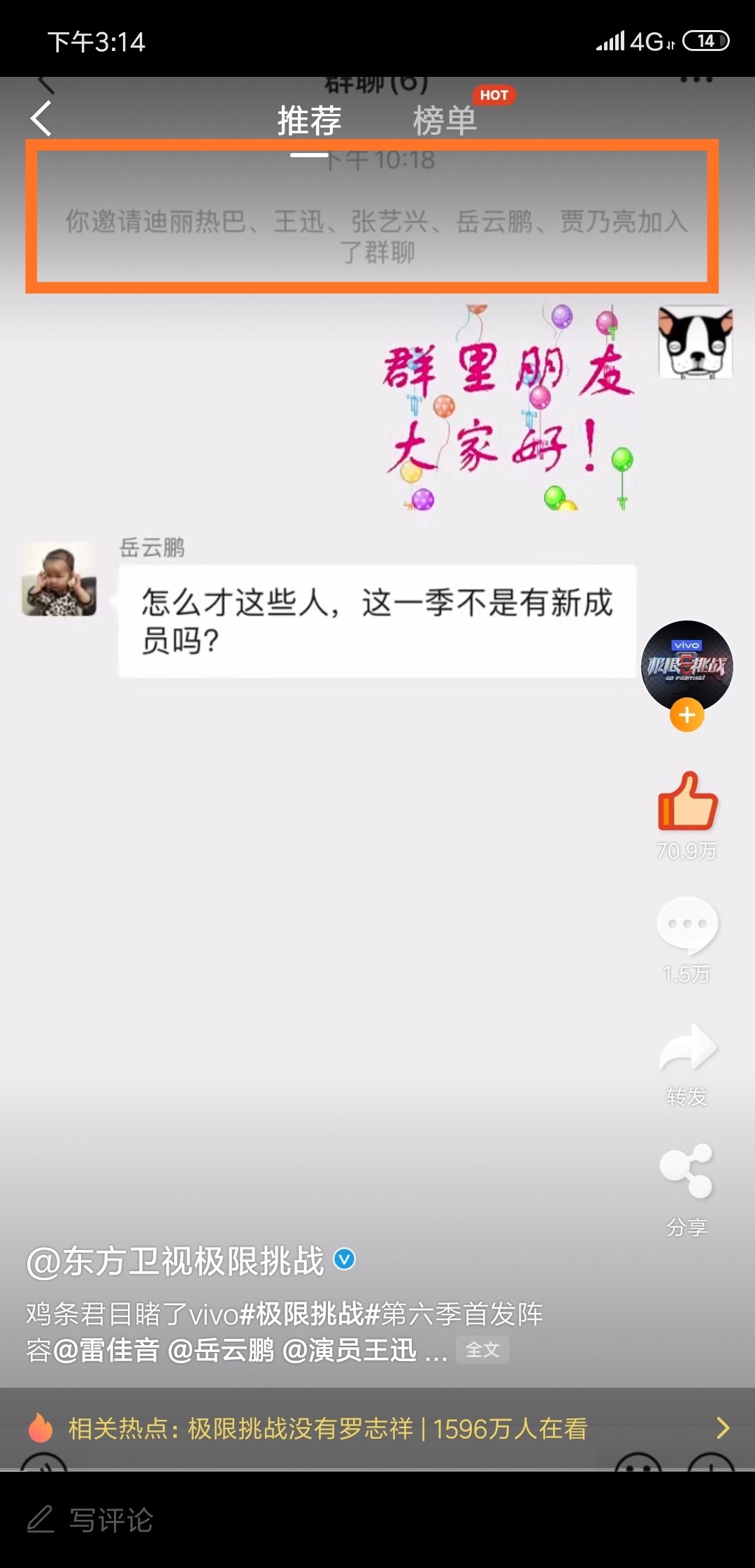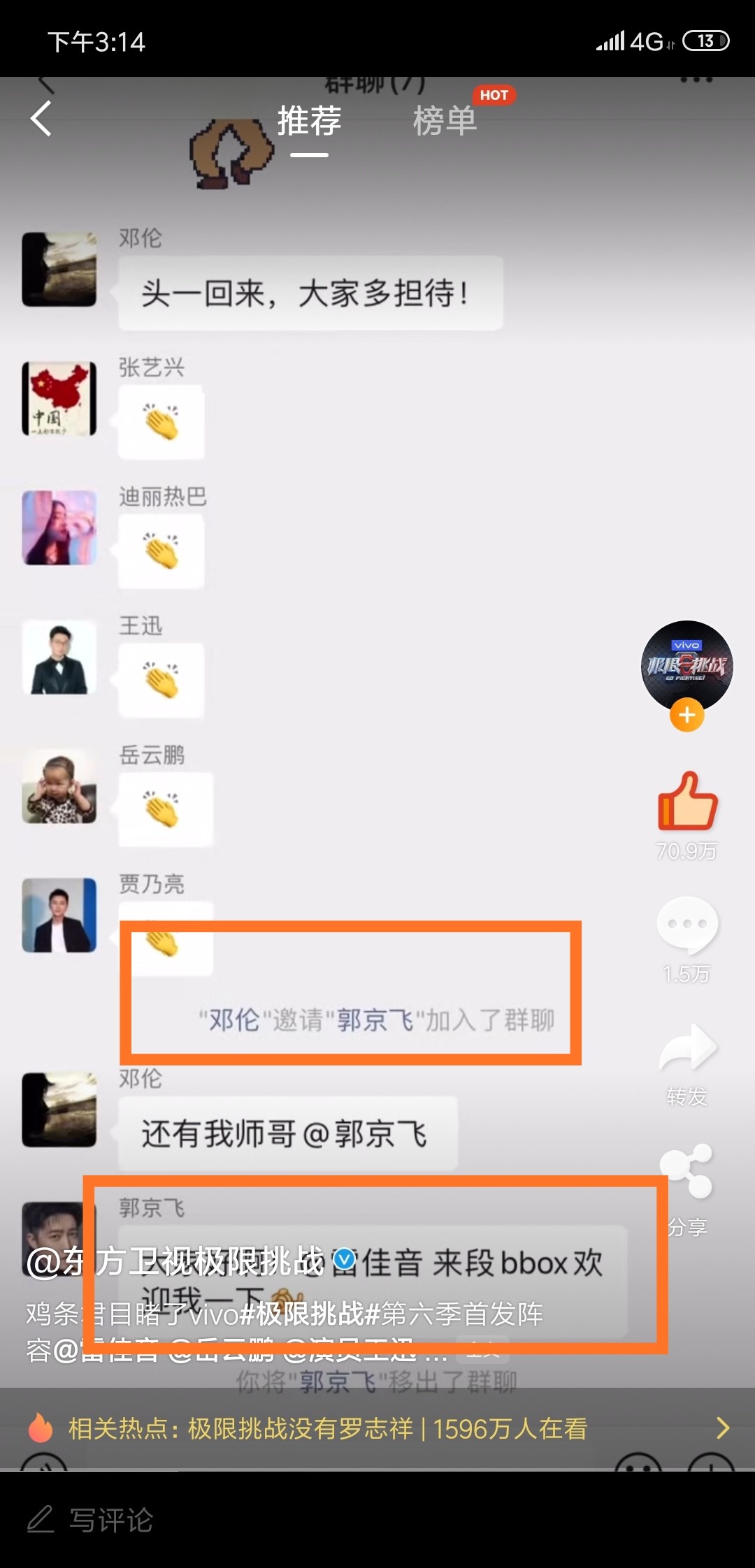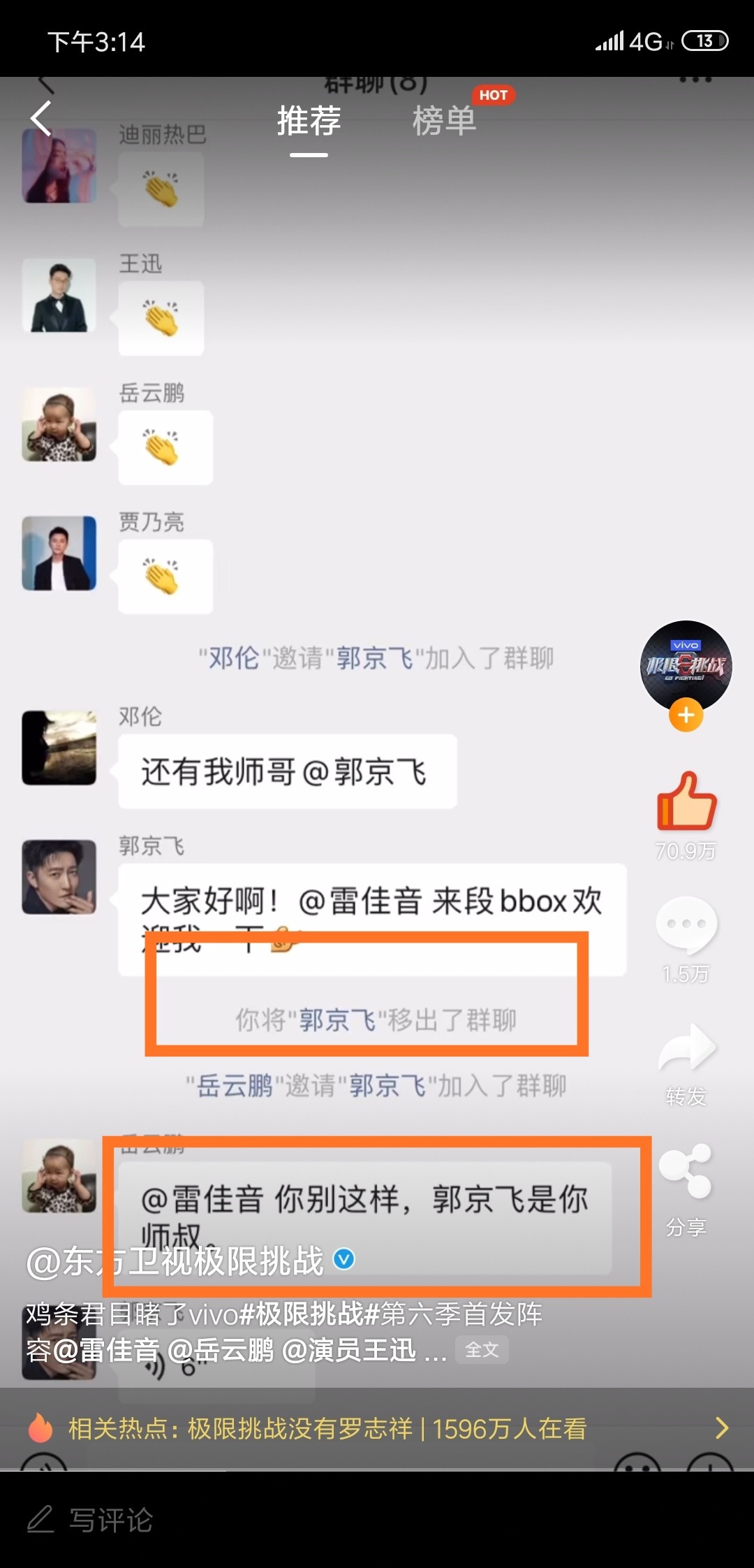 这不,新的一季极限挑战快开始时,雷佳音创建了群聊,他将迪丽热巴在内的几名极限挑战成员拉入了群聊,可偏偏跳过了郭京飞。于是邓伦将郭京飞拉进来,并且介绍了他,而郭京飞一进入群聊就cue雷佳音,让他来段B-BOX欢迎自己,大家都知道雷佳音的口技还是很不错的。听到这话,雷佳音直接将郭京飞踢出了群聊。