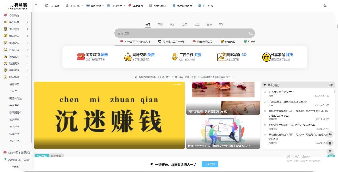 万有导航是一个全能实用的导航网站,聚合了超多不同类型的站点。比如影音娱乐、资源搜索、在线办公、设计必备、媒体运营、软件应用、有趣酷站、阅读时光、自学推荐、动漫资源和设计灵感。