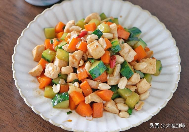 1、鸡胸肉切丁,放入适量食盐、料酒、生抽、淀粉、食用油,抓拌均匀腌制10分钟。黄瓜、胡萝卜洗干净,切成小丁。冷锅冷油放入花生米,小火炒熟后盛出,放凉后剥掉外皮备用。
