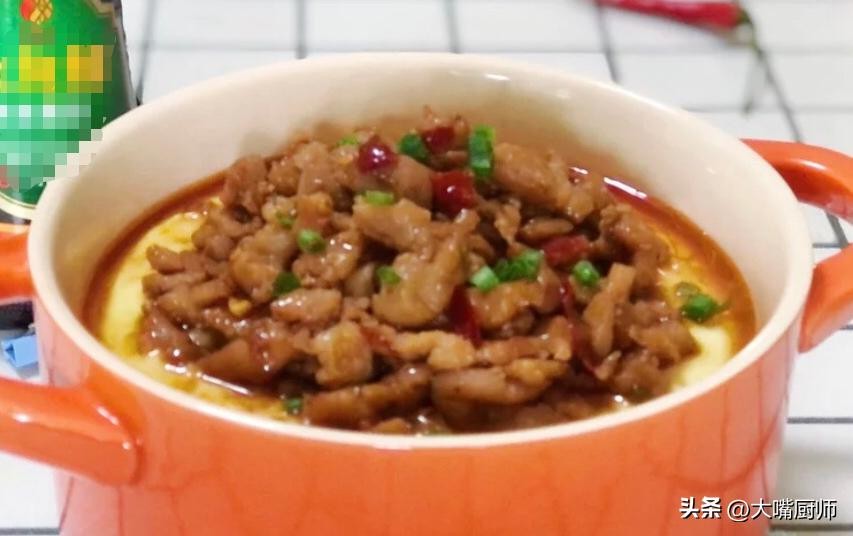 2、五花肉洗剁成肉末,起锅烧油,放入肉末小火煸炒出油,加入豆瓣酱炒出红油,再放入适量生抽调味,淋入水淀粉勾芡至浓稠,浇在蒸好的鸡蛋豆腐上,撒上葱花即可。