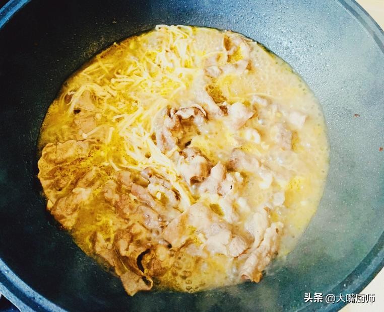 3、放入肥牛卷、金针菇、豆芽,小火煮2分钟,入味后撒上青红椒圈,即可出锅。