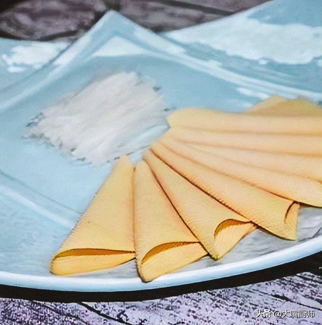 3、用一片豆腐皮包上少许京葱,加上肉丝,卷起来就可以吃了,好吃又减脂。