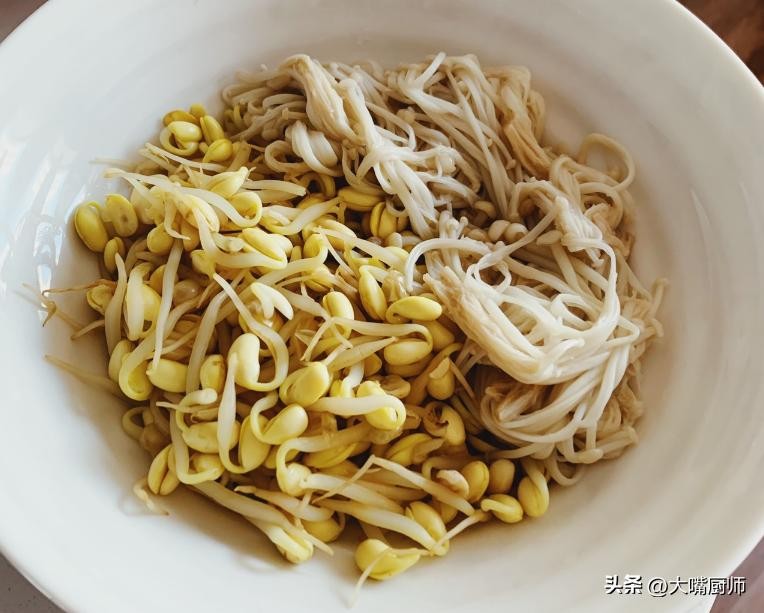 1、金针菇切掉老根,撕成小块洗干净,豆芽淘洗干净。烧一锅开水,放入金针菇、豆芽,大火煮1分钟,捞出过凉水,沥干水分备用。蒜瓣切末,辣椒切圈。