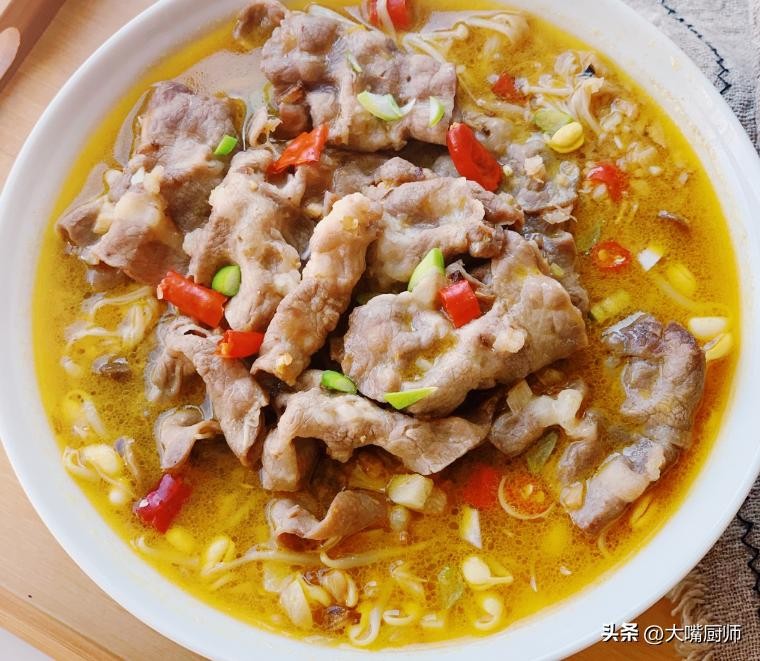 2、烧一锅开水,肥牛卷不用解冻,直接下锅煮1分钟,捞出沥干水分。起锅烧油,大火烧至六成热,放入蒜末、干辣椒爆香,倒入酸汤肥牛包酱料,小火炒香后倒入适量清水煮开。