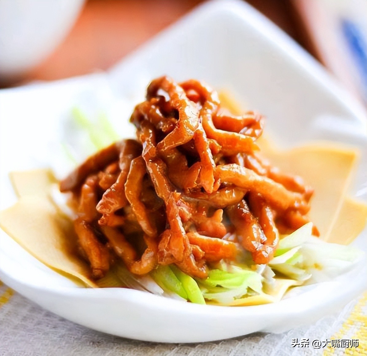1、大葱剥洗干净后切丝,豆腐皮洗干净后切小方块。里脊肉洗干净切丝,加入适量食盐、生抽、料酒、五香粉抓拌均匀,再打入一个蛋清,加入适量淀粉、香油,抓匀后腌制10分钟。