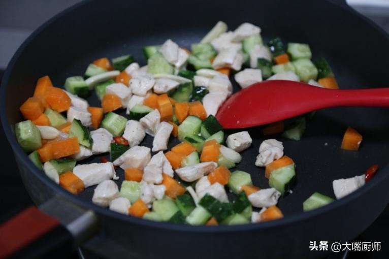 3、倒入胡萝卜丁、黄瓜丁,大火翻炒一会儿,断生后淋入碗里的酱汁,大火翻炒收汁,撒上葱花、小米椒,倒入去皮花生仁,翻炒均匀即可出锅。