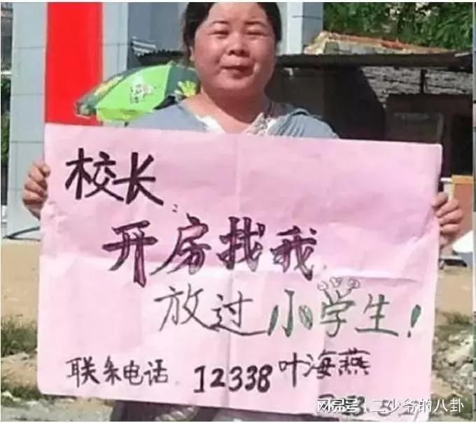 再就是2013年5月,某地某学校发生了一起校长带小学生开房事件,叶海燕于是在某小学门口举牌抗议:“校长,开房找我,放过小学生。”因而又一次瞬间爆红网络。
