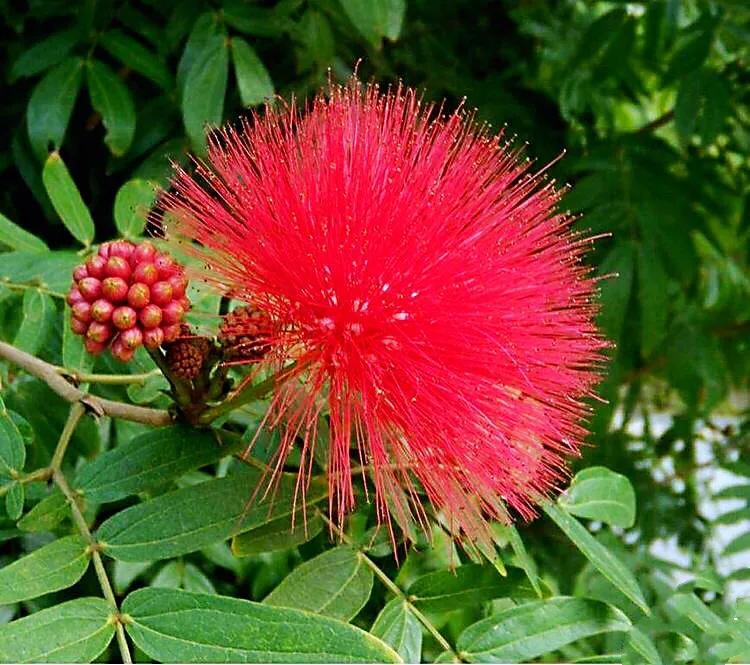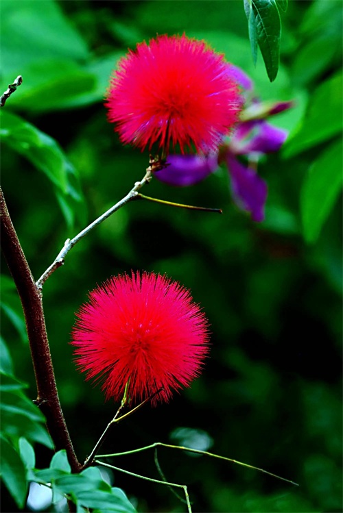 朱缨花 株丛枝条开展。二回羽状复叶,小叶斜披针形。头状花序腋生,直径约3厘米,花深红色。