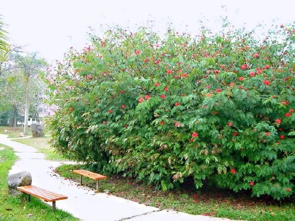 朱缨花 花期长,每年开花两次,第一次3月上旬至7月中旬。第二次10月中旬至翌年2月上旬。 尽管南方不少地方进入冬季园景清淡,可是朱缨花浪漫花朵仍满树红花,弥补南方冬季花色寂廖。