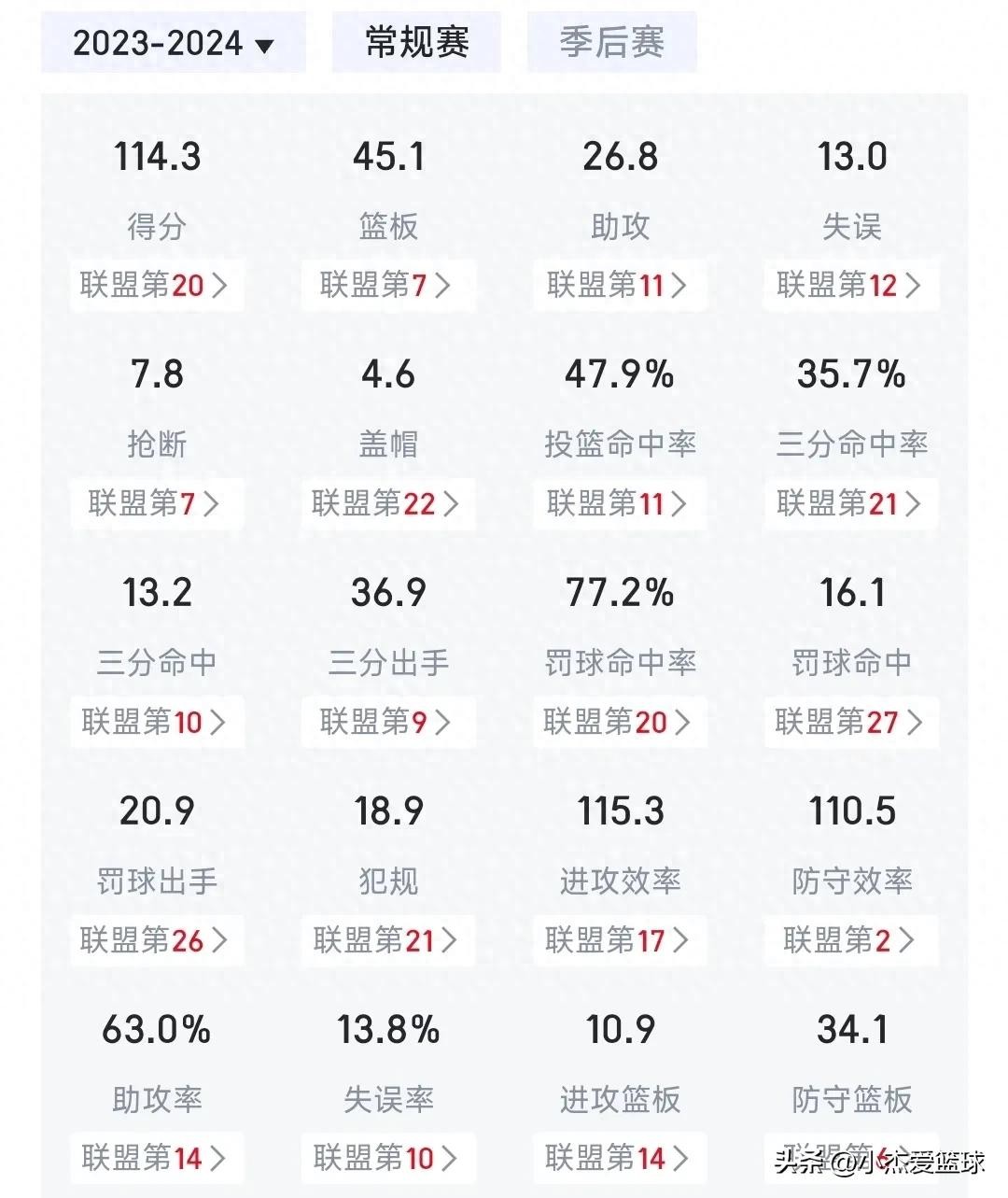 进攻效率115.3联盟第17防守效率110.5联盟第2,三项命中率47.5%,35.7%77.2%场均得分114.3,篮板45.1助攻26.8,是一支典型的防守型球队!