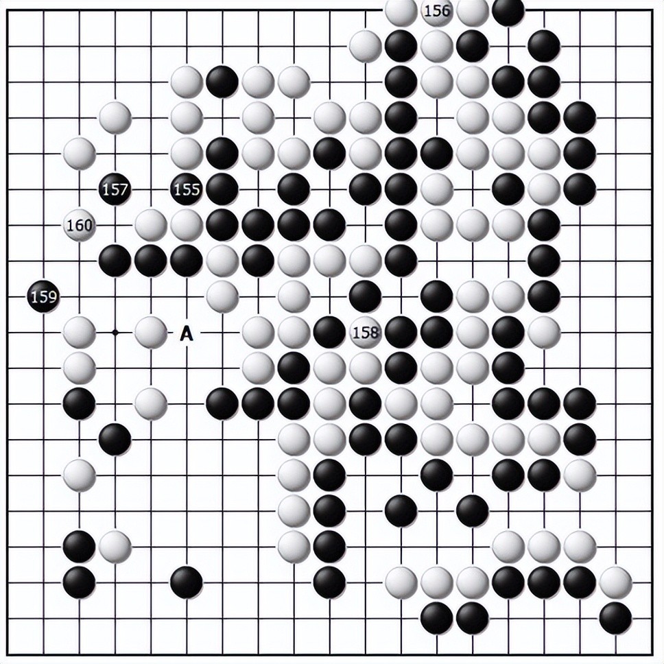 黑155,当然应该在A位靠。如此,黑棋的劫材数不胜数。白156接,机敏。黑157跳,看似吃住2个棋筋。问题是,白158相当冷静。黑159想要做活,没门!