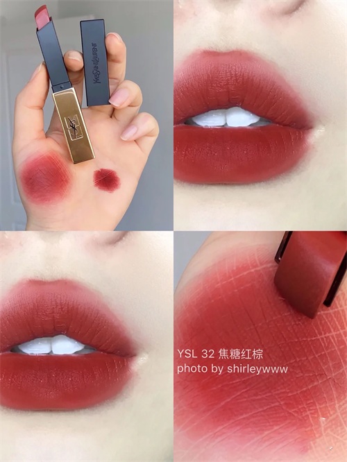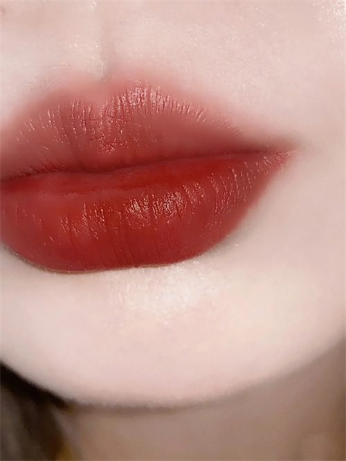 32整体偏暖红的色调,薄涂会日常一些,带有一丝丝的豆沙感,还挺软萌的;厚涂就是超正的红棕色,感觉整体的气场立马就强大了起来,但又不会显凶,自带一种甜辣感。