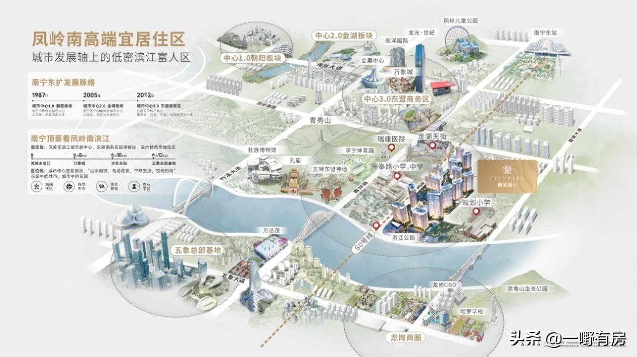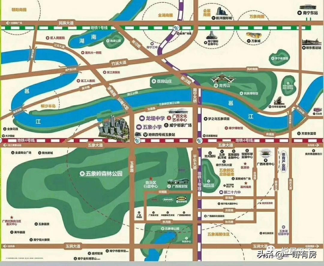 点评:南望五象岭森林公园,北面为五象滨江公园,距离邕江约50米,自然资源丰富,空气也非常清新。距离地铁口200米,无论是否有车,出行都非常的便利。教育方面,从幼儿园到中学也都配齐了,不用担心小孩的上学问题。