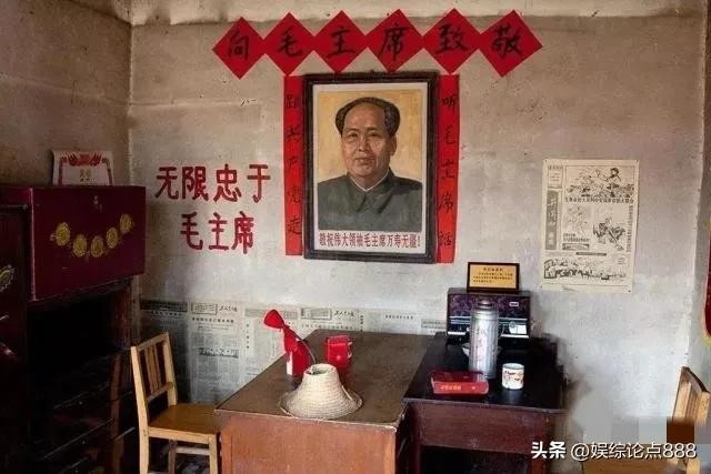 70年代的农村客厅,毛主席画像居于正墙中央,色彩鲜明,目光慈爱又坚毅,下方旧木桌上摆着暖水瓶与收音机,满是质朴岁月痕。