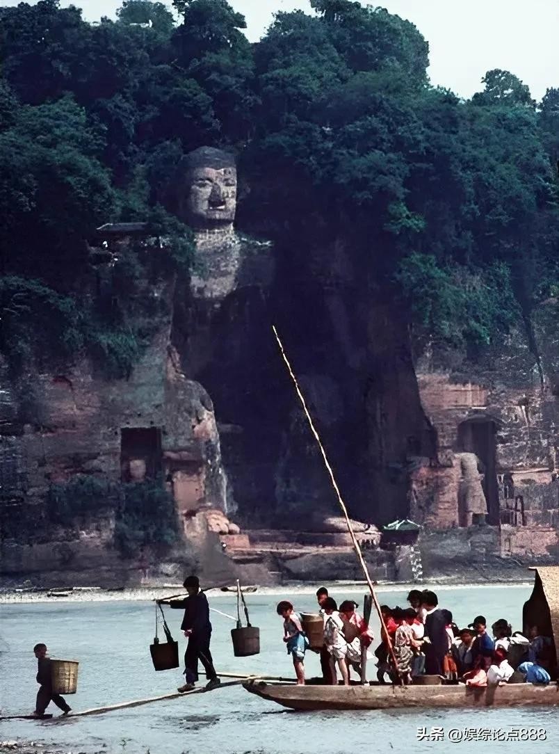 70年代四川乐山大佛前,大佛身覆青苔、灰头土脸,江景古朴。游客寥寥,一群小学生正下渡船,往如今江心岛走去。