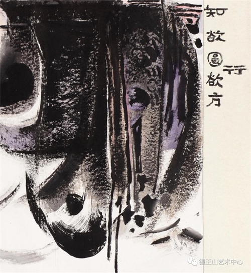 锺正山《澄怀观道》描绘了人物和太极图,画中以抽象的方形与圆形进行切割、排列,通过方圆的外在客观形态来体现“道”,其物象具有符号学元素,让人既可辨别,又模模糊糊不可确定。借助富有意味的线条和皴擦,画家仿佛给出了在黑暗混乱中精神解脱的途径和归宿。换言之,《澄怀观道》既是物化的主要对象,又是心灵最终的归宿。这里面的体悟过程,也是观者身心与整个自然融于一体的过程,最终求得超越现实功利目的、精神自由畅游的境界。