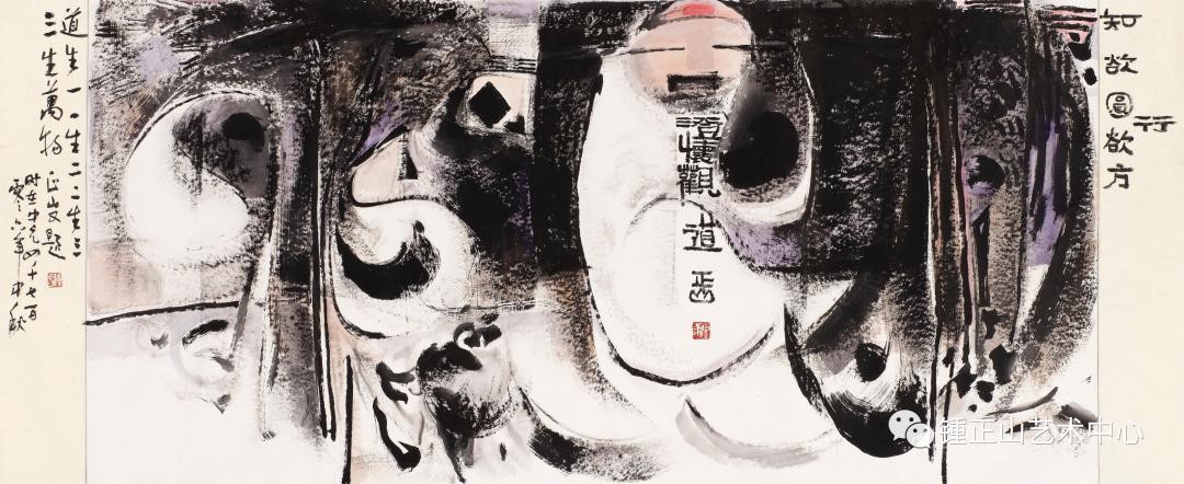 锺正山《澄怀观道》题跋曰:“知欲圆,行欲方”,又题:“道生一,一生二,二三生,三生万物。”众所周知,“澄怀观道”出自南朝宗炳《画山水序》的“澄怀味象”。“澄怀”是指审美主体的空明虚静之心,即无功利、无世情、平静和谐、虚空纳物的审美心境。“味象”则是以虚静之心去体验山水之美,去观照“道”的深奥玄妙。“澄怀味象”要达到的终极目标是“神超理得”,即观照者要直觉感受自然山水之“神”,并与之融融相乐,才算是欣赏到了自然美,由此真正实现了超越,实现了精神的无限自由,从而达到审美观照的最高境界。正如徐复观先生所言:“以玄对山水,即是以超越于世俗之上的虚静之心对山水;此时的山水,乃能以其纯净之姿,进入于虚静之心的里面,而与人的生命融为一体,因而人与自然,由相化而相忘。”这种审美观念成为后世中国画意蕴的基础和核心。