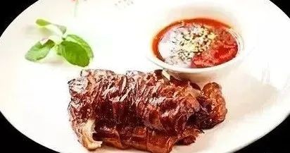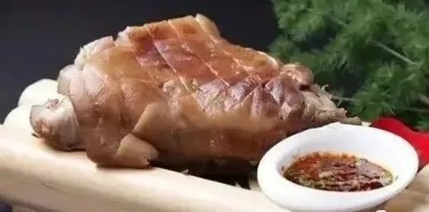 4.卤好的猪前髈打上十字花刀,放入底火200℃、面火150℃的烤箱中烤17分钟,跟一碟辣椒酱上桌,即可。