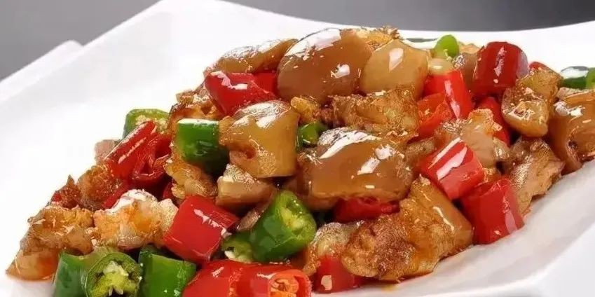 3、将姜,蒜,辣椒煸炒出香味,倒入煨好的猪肉,调味收汁即可。