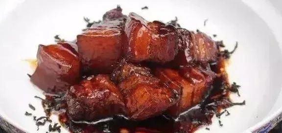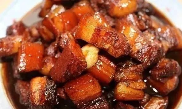 2. 炒锅置旺火上,放入花猪肉烧至六成热时,放入肉块微炸一下,倒出多余的油脂,加入鲜汤、盐、料酒、冰糖、糖色、葱姜、胡椒粉,烧沸撇去浮沫,转入小火烧熟透,拣出姜葱不用,加醪糟汁,用中小火收汁浓稠亮油,起锅装盘内浇上原汁即成。