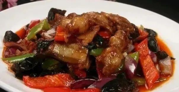 3.客人点菜时,将菜肴倒入沙锅内,撒入青、红椒块和蒜子,大火加热至汤汁烧开,离火上菜即可。
