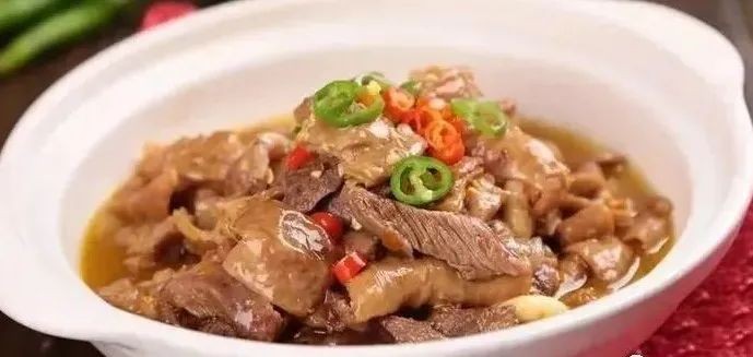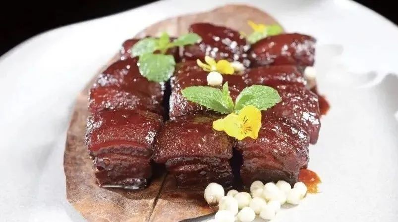4.净锅置中火上,放入红油烧热,下郫县豆瓣炒香,依次下海鲜酱、花生酱、芝麻酱和甜面酱炒香,掺入鲜汤熬出味后打去料渣,调入醪糟、冰糖、红糖、冰糖色、美极鲜、鸡精、味精、胡椒粉和红酒,倒入装有五花肉块的砂锅中,以小火慢煨约2小时,调入红酒,再煨半小时,即可出锅装盘。