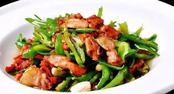 3.炒锅置旺火上,入少许油烧至四成热,下筒筒辣椒炒至呈棕黑色,放入黑豆瓣酱、姜米、本地甜酱炒至出香味,入肉片爆炒至呈灯盏窝状,加白糖、味精调味,入蒜苗翻炒均匀,起锅装盘即可。