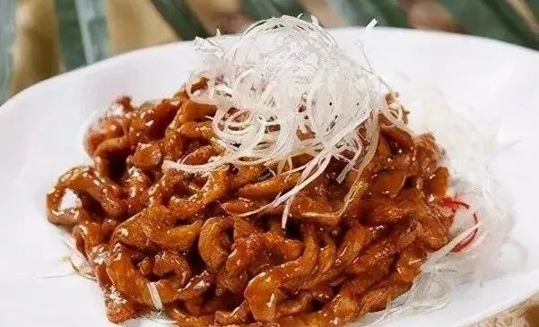 3. 炒锅置旺火上,放混合油烧热至六成油温时,放入肉丝炒散,加甜酱炒出香味,喷入滋汁,待收汁亮油即可起锅装盘,将沥干水分的葱丝放在盘中肉丝上面即可。