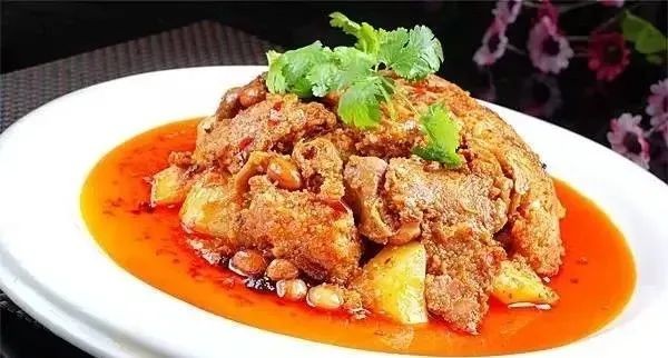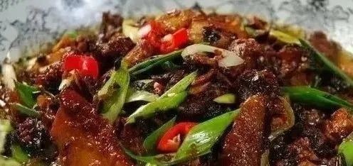 2.净锅下色拉油,烧至六成热时下入腌好的野猪腿煸香,放入干辣椒段、花椒、大蒜,红油豆瓣酱、八角各,桂皮),继续煸炒,放入二锅头白酒略烧,加高汤,加盐,味精,胡椒粉,东古一品鲜酱油、糖色,酱油)调味,小火焖制35分钟收汁。
