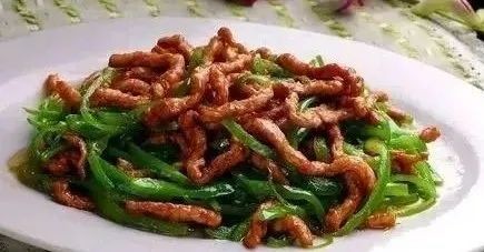 3.将土猪肉煸炒,加入老抽、蚝油,炒熟调入鸡精、味精,放入虎皮椒上,撒葱花即可。