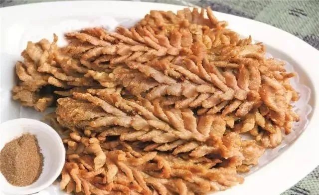 3.将锅中色拉油烧至八成热,下入搓匀面粉的腰花快速搅动,心中默数“1、2、3、4”四秒之后立即捞出。锅中油继续烧至九成热,下入腰花复炸“1、2”两秒之后捞出控油即可装盘,带椒盐上桌蘸食。