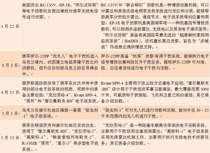 4月中旬,俄军利用“莫斯科-1”电子战系统对北约飞机进行监测,并引导“克拉苏哈-4”等电子战系统对北约E-8C等预警机的雷达进行致盲干扰或欺骗,拒止其对俄军战场辐射源的探测。俄军利用“摩尔曼斯克-BN”短波侦察与干扰系统,侦察北约预警机和侦察机通信,并对北约军机的指控和通信系统进行集中式电子攻击,堵塞或阻断美空军短波全球通信系统等在内的短波通信系统。俄军利用“伊尔-22PP”电子战飞机对北约RC-135等侦察机进行电子干扰,从而保护俄军飞机免遭北约军机探测。4月下旬开始,因俄罗斯电子战装备作用的充分发挥,北约机载情监侦系统对乌克兰的支援能力大幅下降。
