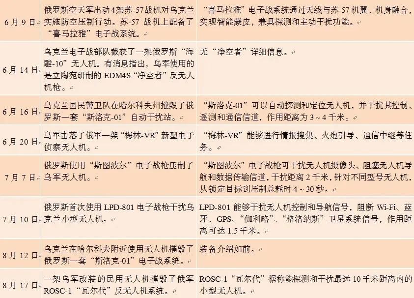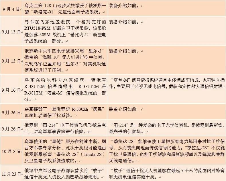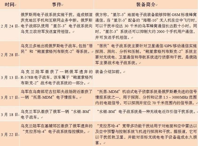 俄乌冲突是装备先进电子战系统的武装部队在大规模常规战争中对抗的罕见实例。自2022年2月24日俄乌冲突爆发以来,俄乌以及北约国家围绕电磁频谱展开了激烈的交锋,大批电子战装备出现在俄乌战场上,俄罗斯电子战装备对乌克兰军事行动造成了极大阻碍,乌克兰也缴获或摧毁了俄罗斯多型电子战装备。我们首先按照时间线对公开渠道获得的俄乌冲突电子战事件及涉及的电子战装备进行一个简单的梳理,如表1所示。然后,对俄乌冲突中俄罗斯电子战装备的作战应用和乌克兰电子战装备及其采取的电子战对抗措施进行简单介绍。