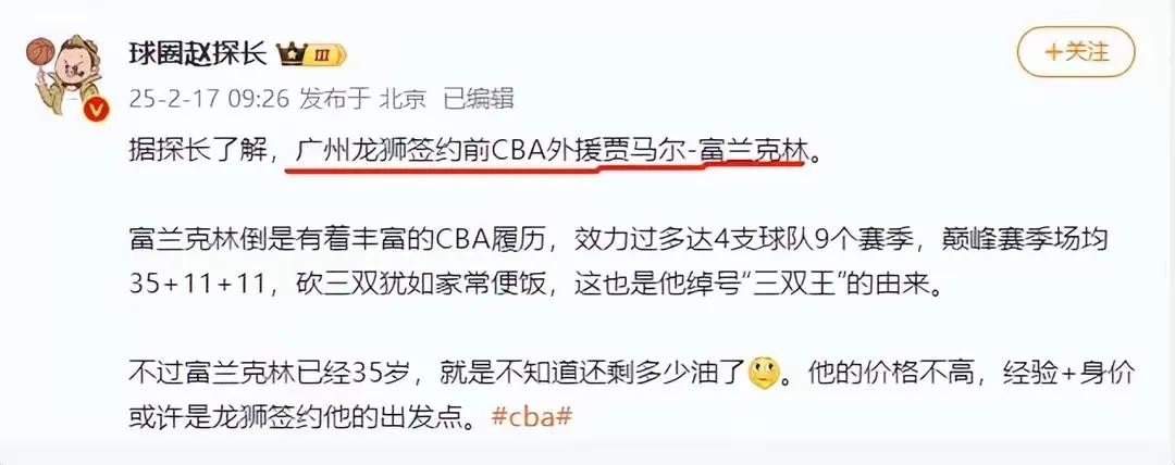 这个转会窗口期,CBA多数球队展现出争冠雄心——新疆队豪掷重金签下琼斯、威金顿两大顶级外援,辽宁引入曾效力凯尔特人的全能内线奥利弗。但广州龙狮却逆流而行:裁掉场均22.5分的核心外援麦考尔与抢断王沃伦,转而签下辗转山西、上海等4队均遭弃用的大伤老将富兰克林。数据显示,富兰克林上赛季在上海场均仅6.5分,真实命中率排名全联盟倒数第三,其横移速度经专业测评已下降34%。