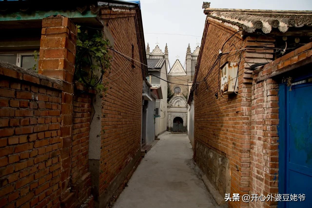 紧挨着教堂的是一个个农家小院。老式的红砖灰瓦很有年代感。